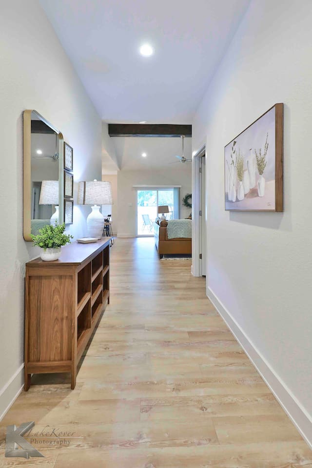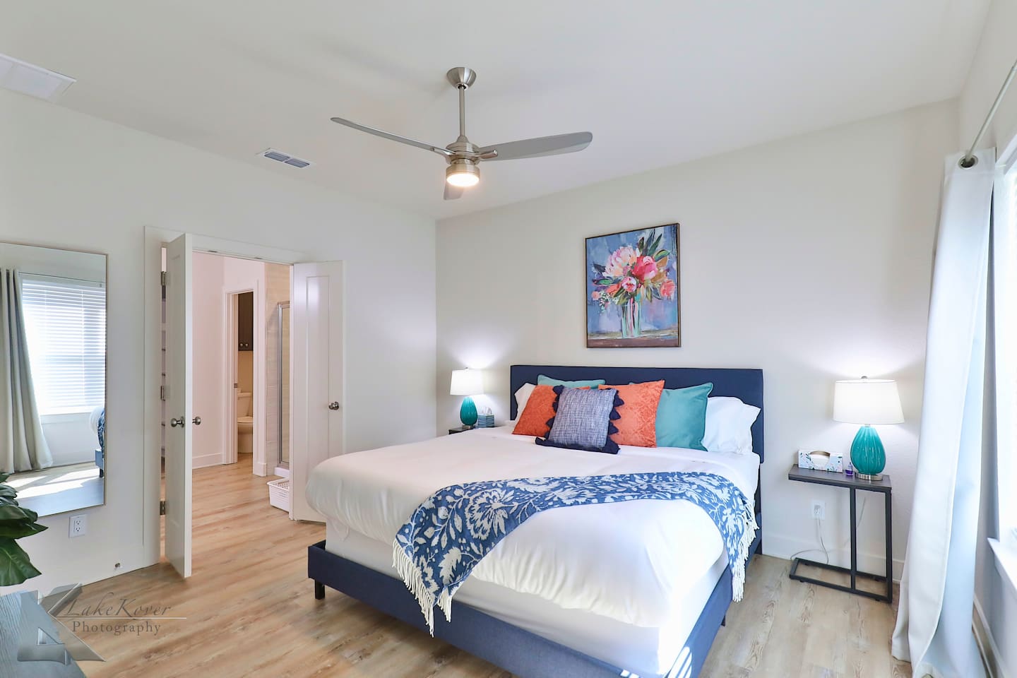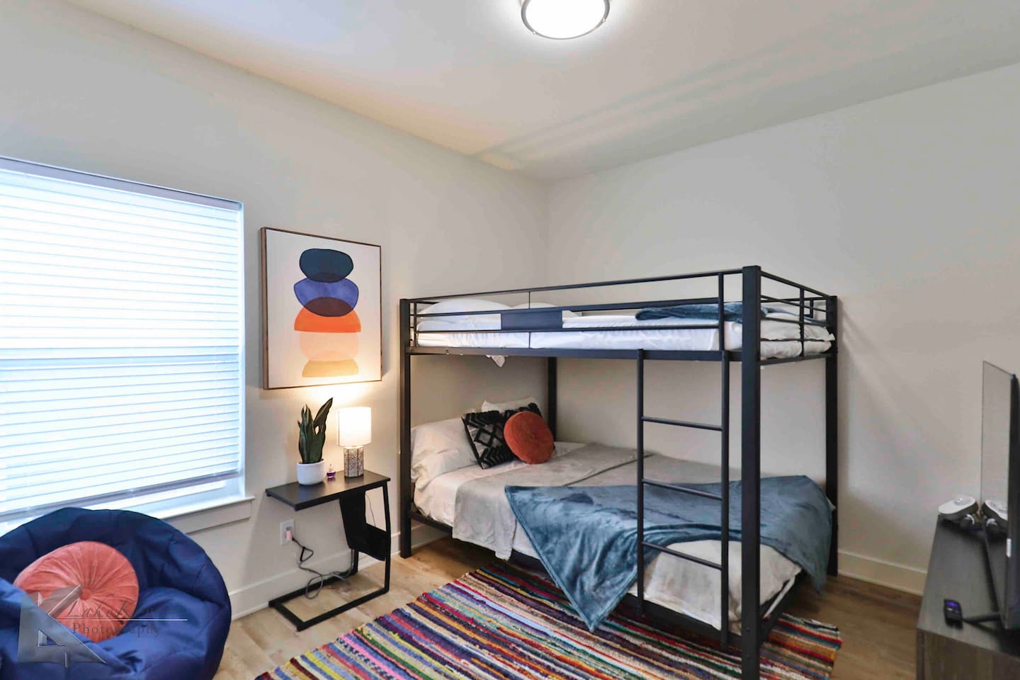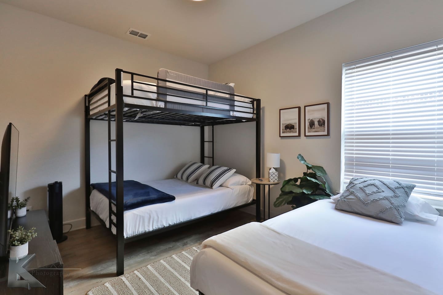 The 2 units are separated by a shared wall and 2 fenced back yards with separate entrances. This is perfect for a school team looking for separate sleeping areas, corporate workers, family reunions, and wedding guests.