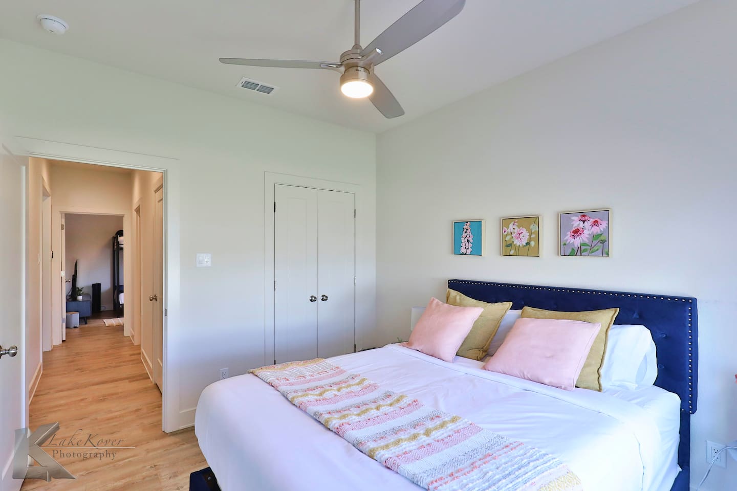 This lovely country modern home comprises both sides of a duplex unit with 2 x 2 car garages, 2 kitchens, a total of 4 full bathrooms, and total of 6 bedrooms with 11 total beds (2 king bedrooms , 2 queen bedrooms, 2 bunk rooms with queen size beds and a twin bed ) to sleep 18 guests! Parking can accommodate 4 cars in garage, and 4 more cars in the driveway.